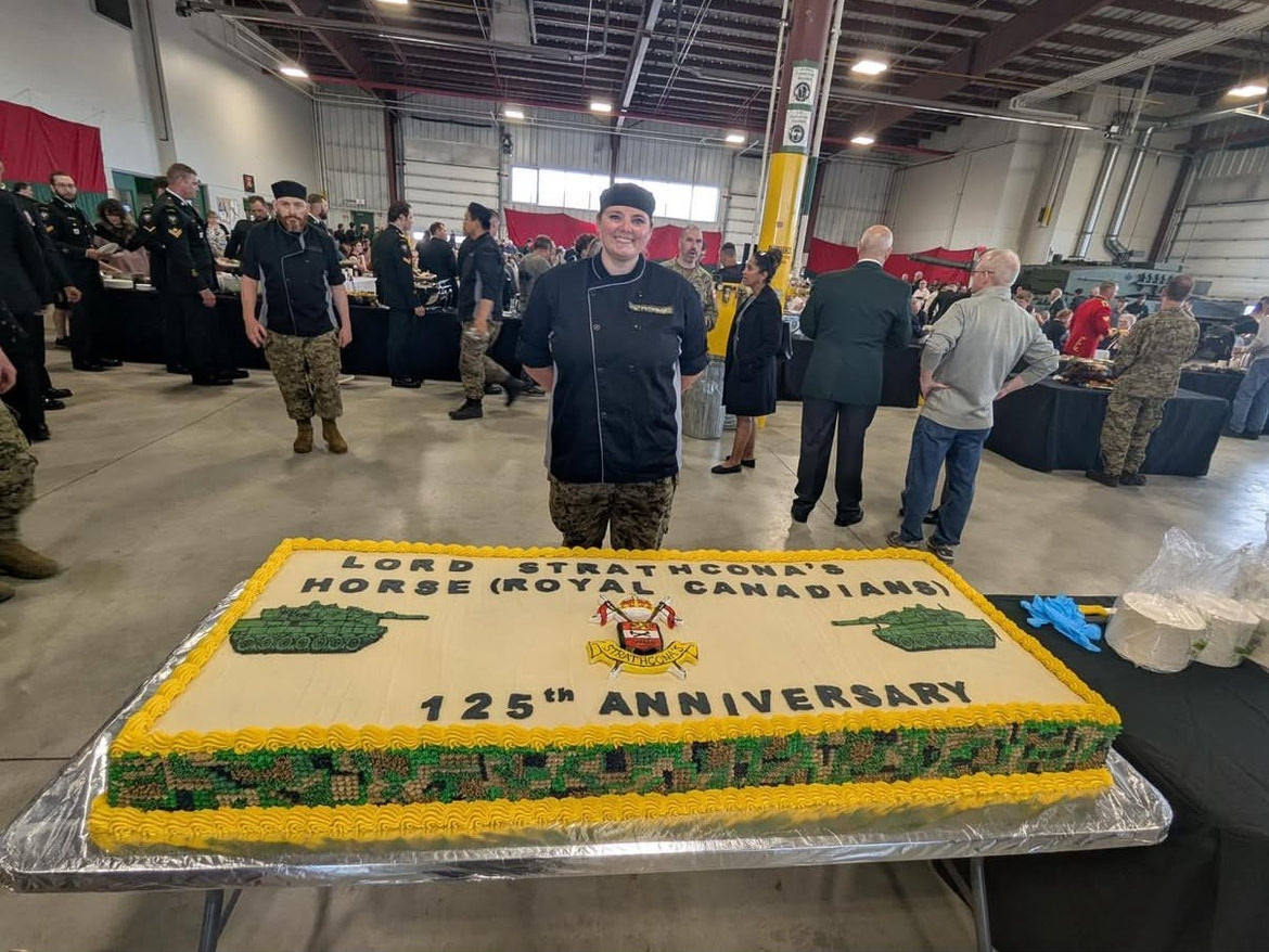 The reception that followed at the Harvey Building had a great turnout and displayed vehicles from many different eras of our history for visitors to examine. The Regimental cooks put on a great spread with a pig roast that took multiple long days and nights to prepare. Special thanks to Capt Phil Webster and Cpl Miguel Blanco for the amazing Regimental artifacts brought up from The Military Museum in Calgary to display. The crown jewel of the display were the three Regimental Victoria Crosses earned by Sgt Richardson, Lieutenant Harvey, and Lieutenant Flowerdew, together in one place to commemorate this significant milestone.
