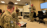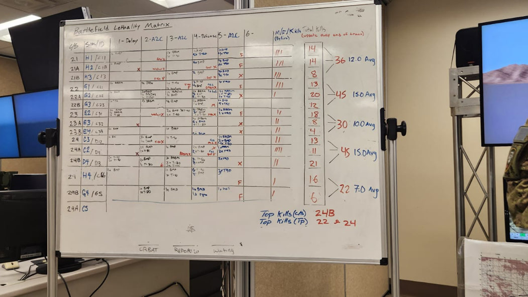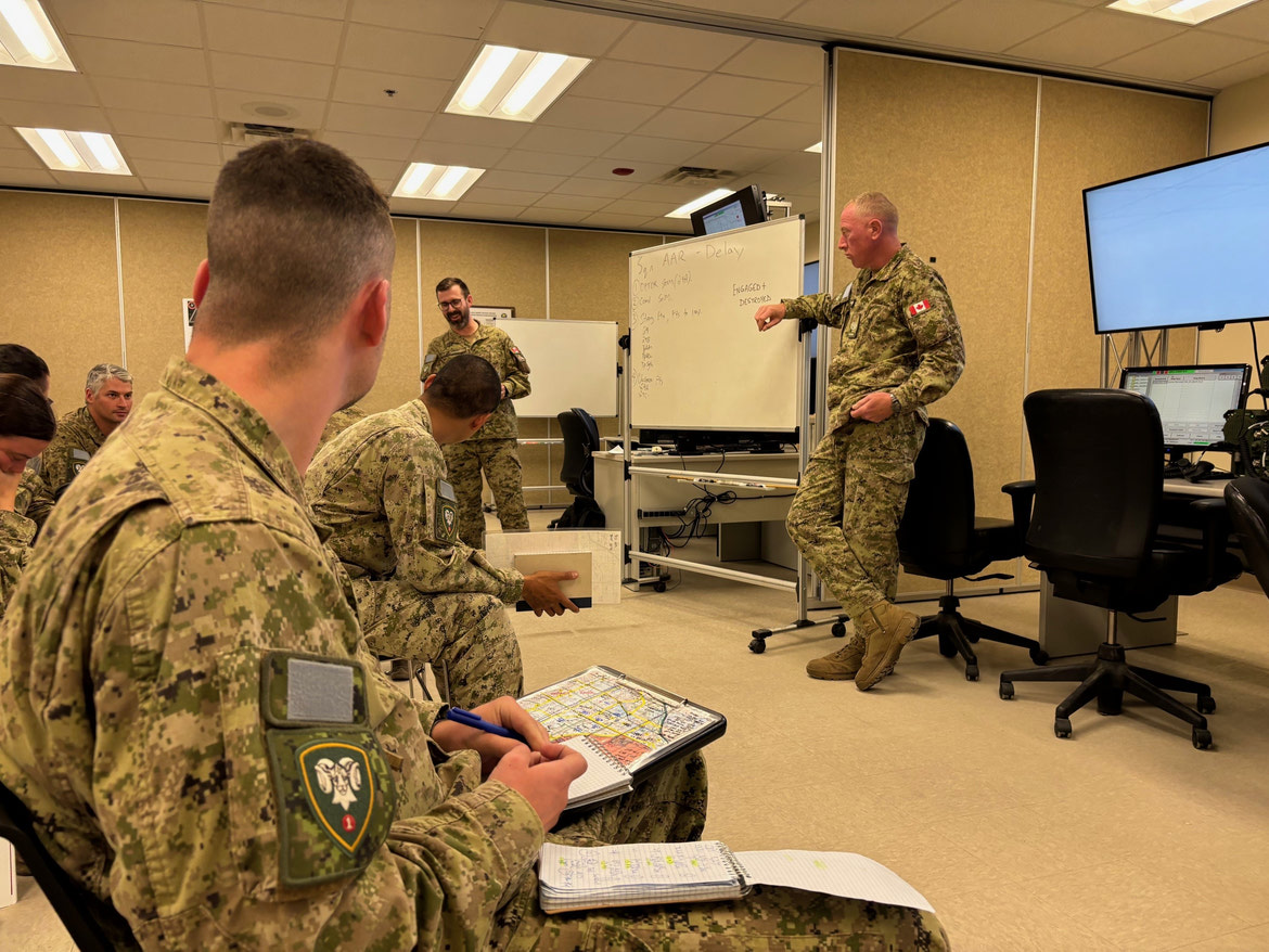 Friday’s validation sees B Sqn engaging a formidable enemy using the Fort Irwin training area: we’re vastly outnumbered, the ammo resupply function in the simulator is glitching and call signs are randomly flipping upside down, catching on fire in the process. The support staff of the Clarke Simulation Centre have the utmost professionalism, quickly trying to resurrect errantly destroyed vehicles as we head west to our first objective. With beverages prohibited inside the simulators, everyone has become a camel: unable to stop for both the bathroom or to take a drink. The both-ears-only headset, rapid-fire contact reports and flurry of orders coming across the net create an atmosphere of orchestrated chaos.