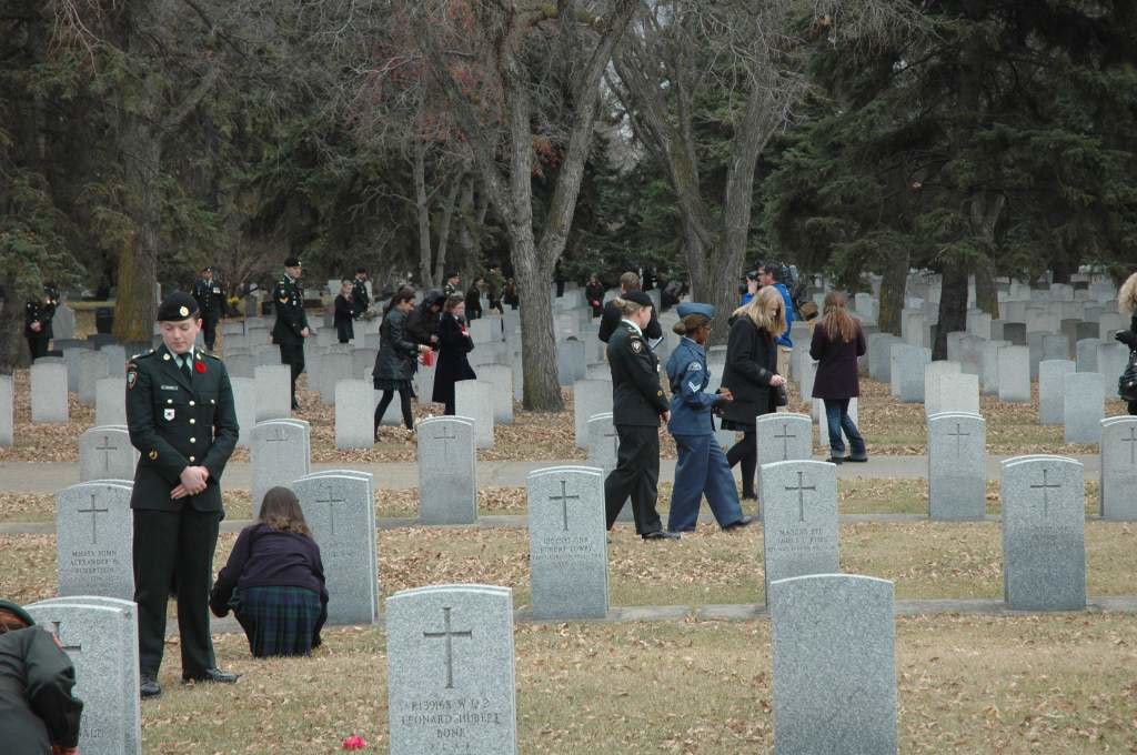 This year I was given a great honour to assist in the coordination of a Remembrance Week initiative that was dreamed up by Mrs Keeley Yates and Mrs Maureen Purvis. The No Stone Left Alone Memorial Foundation is a group of citizens who essentially wanted to honour Canadian Veterans while keeping the history and memory of the sacrifices that were made alive in the minds of today’s youth. On 10 November 2011, 300 students from the Nellie McClung program, along with members of the Regiment, laid approximately 2900 poppies on the gravesites of veterans at the Field of Honour at Beechmount Cemetery. This was the first event of its kind for the Foundation and their goal was to ensure that each veteran in the Field of Honour had a poppy in front of their headstone for Remembrance Day. Their ultimate goal is to have the initiative spread across the country so that every veteran laid to rest in the country will have a poppy on the day of remembrance. An ambitious but honourable dream.