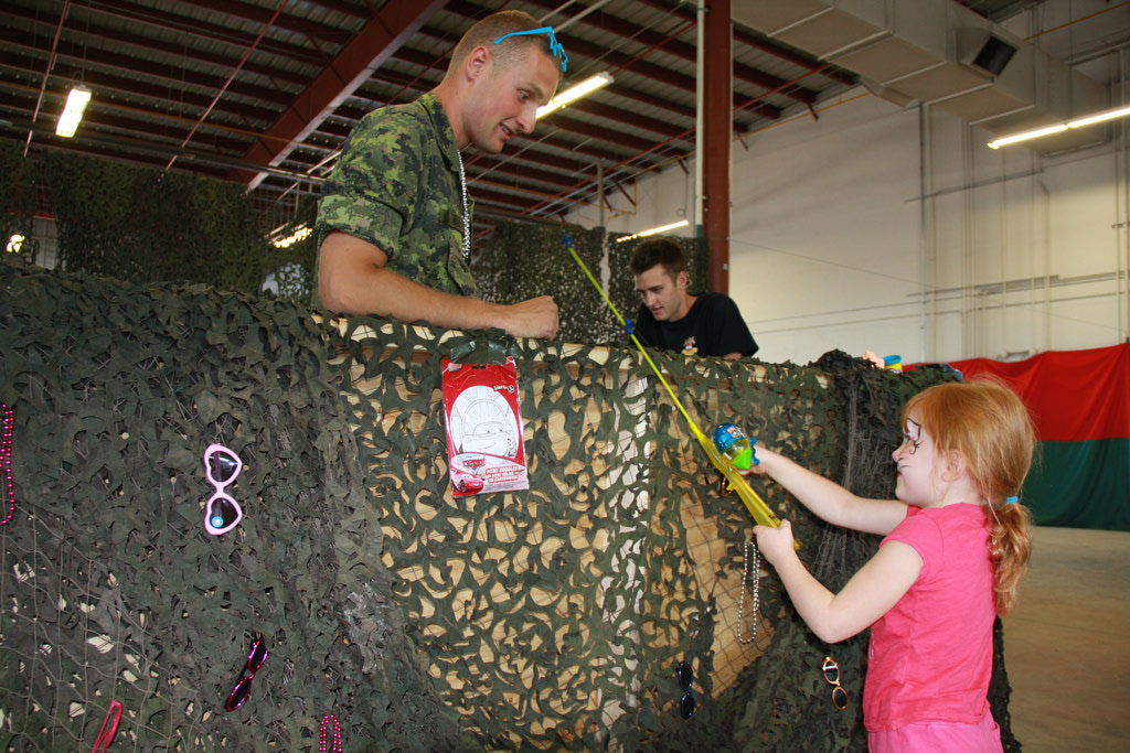 Throughout the day there were many events to be had. There was a show and shine which saw cars like Capt Alex Nitu’s Delorean DMC 12, MCpl Shaun Sullivan’s 1940 Plymouth (which he built), or the winner Cpl Chris Sykes’ 2011 Chevy Silverado 4x4. I have it on good authority at least one of the judges likes “monster trucks”! We also had numerous friends of the Regiment show their own military projects with various jeeps and trucks. For the kids, the carnival games offered a chance for prizes and arcade games kept them busy while mom and dad talked to old friends and new acquaintances. The few brave (kids of all ages) also had a chance to test their pitching arms with a shot to see the CO, LCol Trevor Cadieu and RSM Bill Crabb get soaked by water balloons with a new twist on the old dunk tank. In all there was not a bored kid (or parent) in the Harvey building that day.